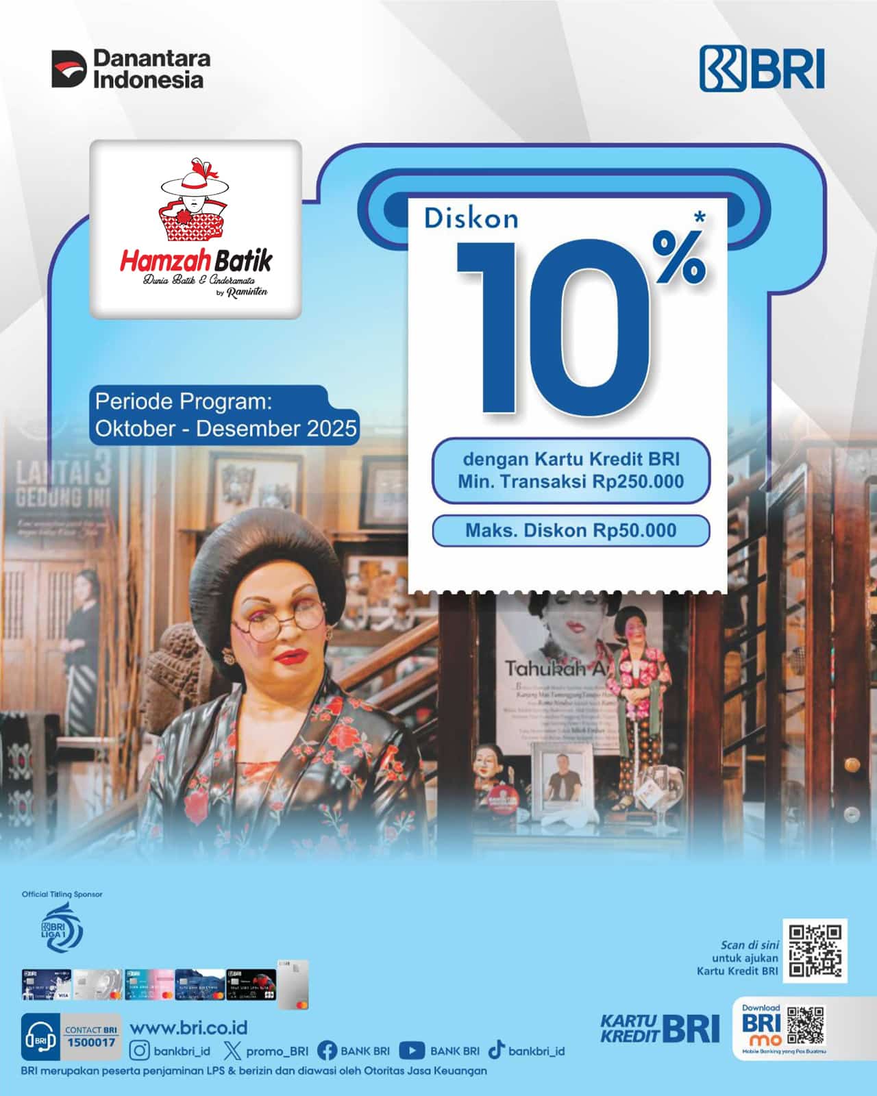 Potongan harga hingga Rp 50.000 dengan minimal belanja Rp 250.000 menggunakan kartu kredit BRI.